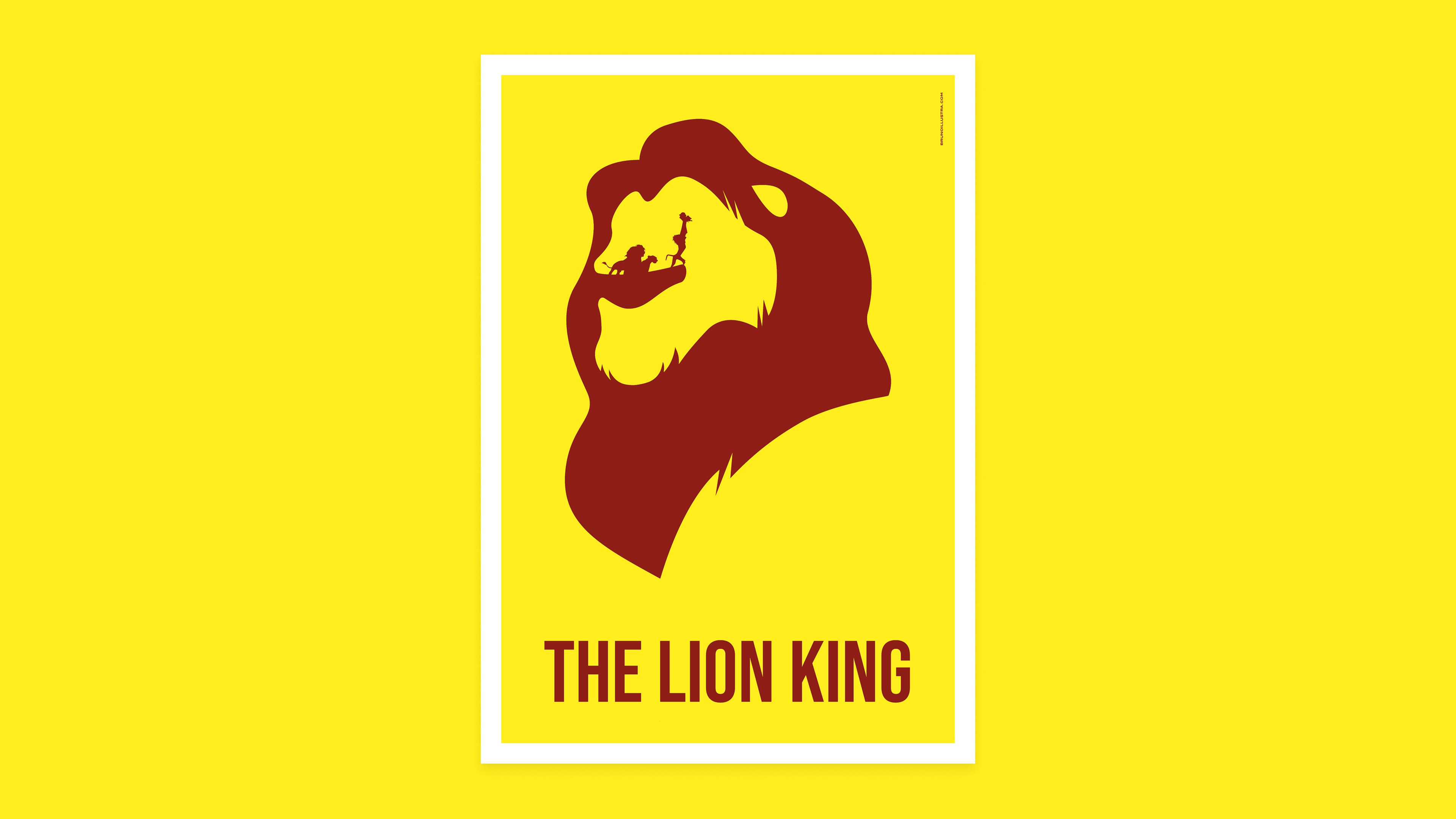 This minimalist interpretation of The Lion King (1994) uses vibrant colors, such as yellow, to evoke joy and nostalgia. The composition emphasizes Mufasa’s imposing silhouette, within which the iconic scene of Simba’s presentation offers a striking reinterpretation of this animated classic.